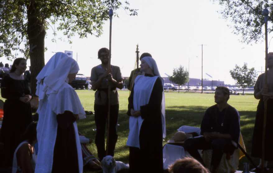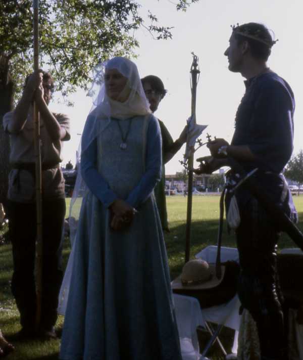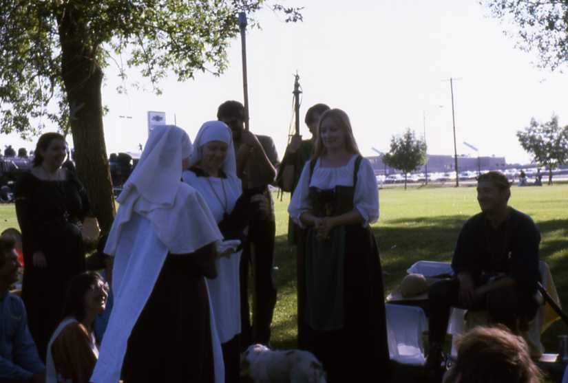 After the tourney court was held during which the award for the Riddle Quest was given to Erlon the Farfaring. We even had a couple of tie breaker riddles ready, but had no need for them because Erlon was the only one who got all the riddles right. They were rather hard. Due to her pilgrimage to Vernal, Baroness Ferelith MacDonald presented her coronet to Baron Sir Robert. As a pious deed of penance (we still can't imagine what our beloved Baroness would ever need to repent for) she will be dedicating her time during her pilgrimage to being a sister of the Order of St. John. She will be instructing the postulates of the convent in modesty and proper manners. She has chosen the religious name of Sister Erotica. During the court, two of the sisters of the House came forward and garbed her in a nun's habit, and she left with them.