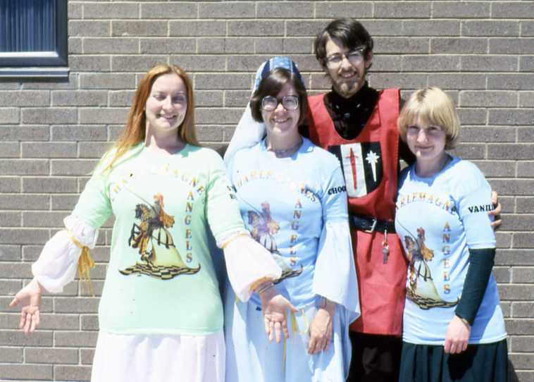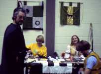 From left to right, Gallowglass, Jerilyn of Vert Silva (in Shakercon tee shirt), Lady Ferelith MacDonald, Charles of Galway (getting either into or out of armor). The banners in the back are Jerilyn's and Rhonwen's. Michael the Lucky gifted the Hastle Castle ladies with tee shirts. They say "Charlemagne's Angels" (a takeoff, of course, on a TV show of that era) and have their "flavors" on the sleeves. From left to right, Ferelith (strawberry), Rhonwen (chocolate), Michael, and Jerilyn (vanilla).